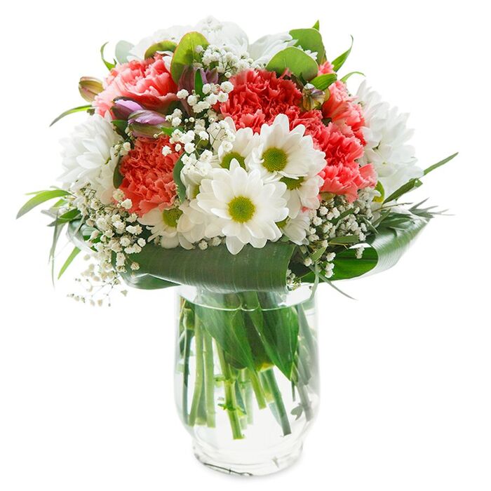 Delight someone special with our beautifully crafted flower arrangement. This unique bouquet features a harmonious blend of snow-white chrysanthemums, gypsophila, and light pink carnations, elegantly wrapped in lush aspidistra leaves. The soft color palette exudes elegance and charm, making it a perfect gift for any occasion.